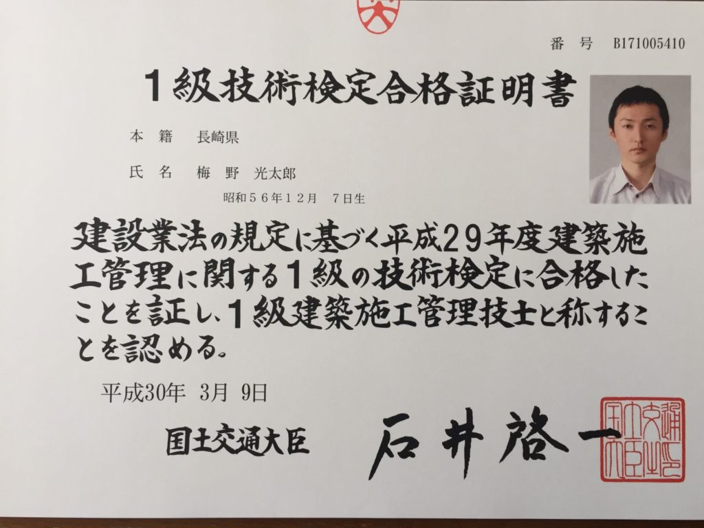 30年2月に 1級建築施工管理技士に 梅野 光太郎君が合格
