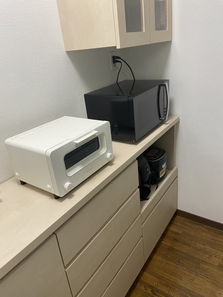 次に、キッチン収納家具です。炊飯器置き場は、抽斗タイプ、天板上にレンジ等の家電を置く形です。上部吊り戸はガラス窓をつけました。家具の隣にウォーターサーバーがあるのですが、実は、その替用のウォーターストックを置く場所も作っています!