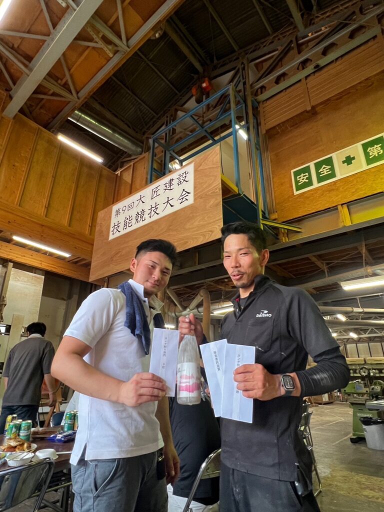 なんと、丸太とカンナ薄削り両部門で、外注大工さんに二冠を持っていかれてしまいました。課題競技の連覇記録更新中の大工さんは丸太で3位となり、悔しい表情も見せていただきました。新人賞を獲得した入社3年目の社員は、全体6位と健闘!皆、いろいろな思いを持った結果となりました。