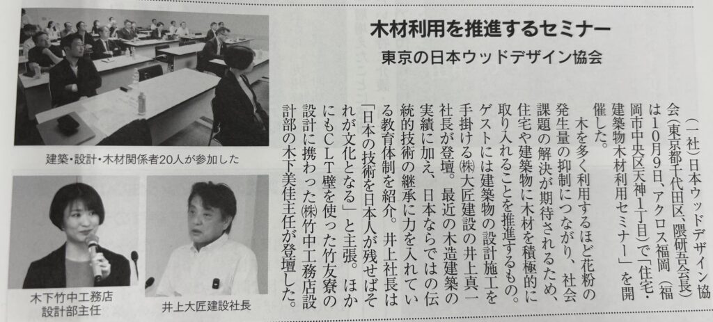 10月9日にアクロス福岡で行われた、(一社)日本ウッドデザイン協会主催の「住宅・建築物木材利用セミナー」に、